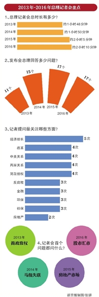 总理记者会历来是每年两会的"压轴大戏",在之前的四次记者会上,李克强共回答了60个问题,内容多涉及经济、外交、民生等领域,以及上一年发生的热点事件。 新京报记者梳理发现,前4次总理记者会中,经济增长、改革、简政放权、中美关系等问题出现的频率颇高,几乎是每年的必答题。
